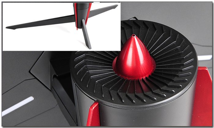 하늘로 솟아 오를것만 같은 제트엔진 스타일의 받침대 모습으로 다리 부분에 메탈 소재를 적용해 내구성을 높였으며 일반 받침대와 확연히 비교되는 세련된 모습을 보여주고 있다. 다양한 각도조절로 편의성을 높인 제품으로 4cm 높이조절이 가능하며 틸트 기능도 제공된다. 사용자에 맞는 최상의 시야 환경을 편하게 설정할 수 있을 것이다.