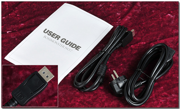 풀KIT 의 모습으로 DP 케이블이 기본 제공되는 것이 눈에 띄며 전원 케이블과 사용 설명서가 지원되는 것을 확인할 수 있다.