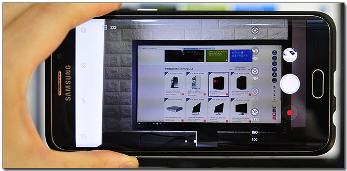 LCD 모니터의 플리커 현상을 확인하기 위해서는 약간의 작업이 필요하다. 우선 모니터의 밝기를 70%~80% 로 설정하고 웹페이지 등의 흰 배경을 띄어둔다. 그 다음 스마트폰 카메라를 실행해 전문가 모드 (셔터스피드 1/100 이상) 를 실행하면 플리커 여부를 확인할 수 있다. 상단의 사진은 두 개의 모니터를 각각 확인한 모습으로 지속적으로 플리커가 발생하는 테스트용 모니터와 달리 BOSSMONSTER NO.7 WQHD 커브드 144 에서는 전혀 플리커 현상이 발생하지 않는 것을 알 수 있다.