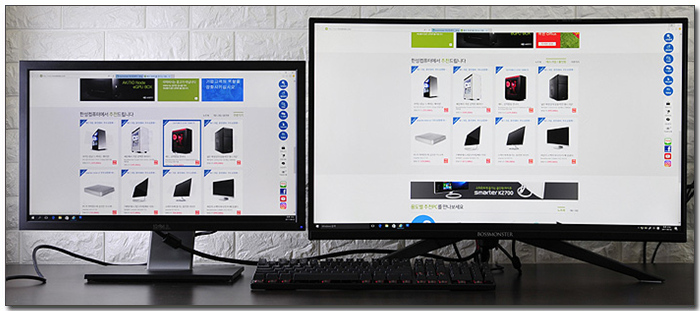 상단의 사진은 플리커 현상을 테스트 하기 위해 2개의 모니터를 동일하게 셋팅한 모습으로 육안으로는 플리커 현상을 확인할 수 없다. (슬림 베젤을 적용해 두꺼운 베젤을 사용한 테스트 모니터와 달리 높은 몰입감을 구현했다.)