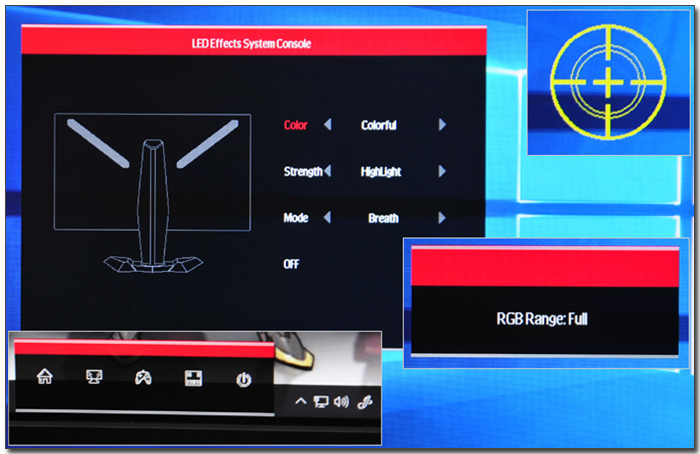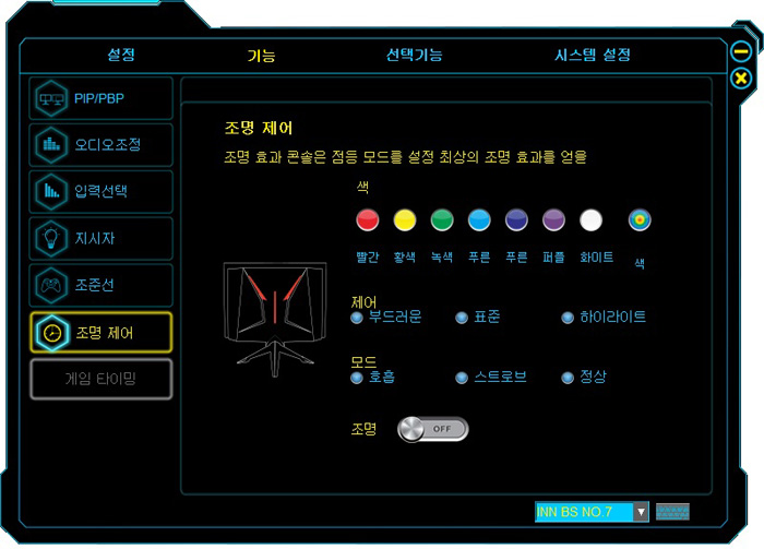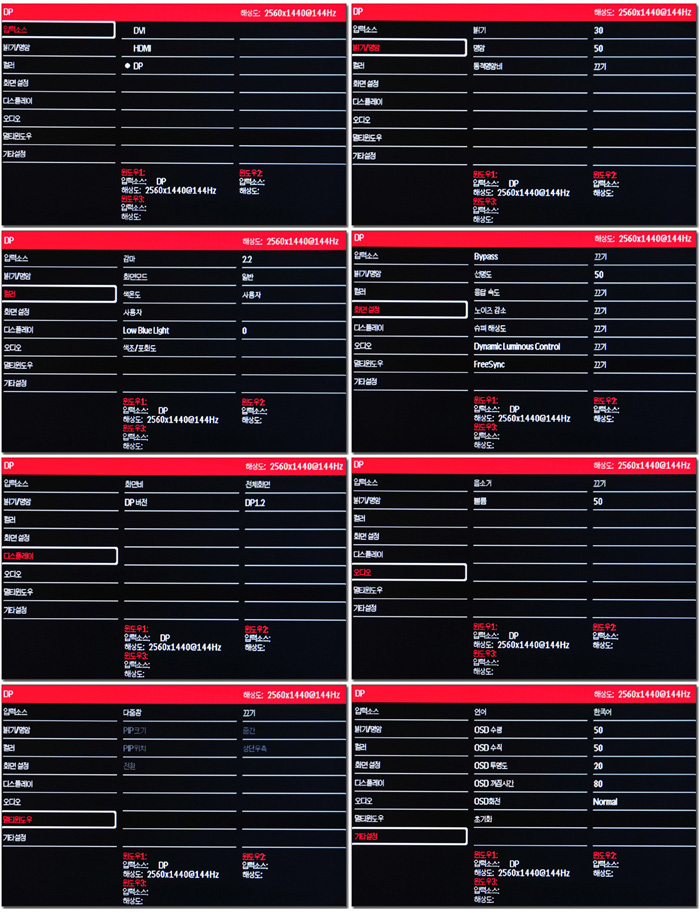 OSD 메뉴의 모습으로 버튼을 누르면 디스플레이 에서도 기능이 표시되어 다이렉트 기능을 빠르게 설정할 수 있는 장점이 있다. 특히 OSD 메뉴에 들어가지 않고도 조준선이나 RGB 모드 변경, 백라이트 설정이 가능하다.