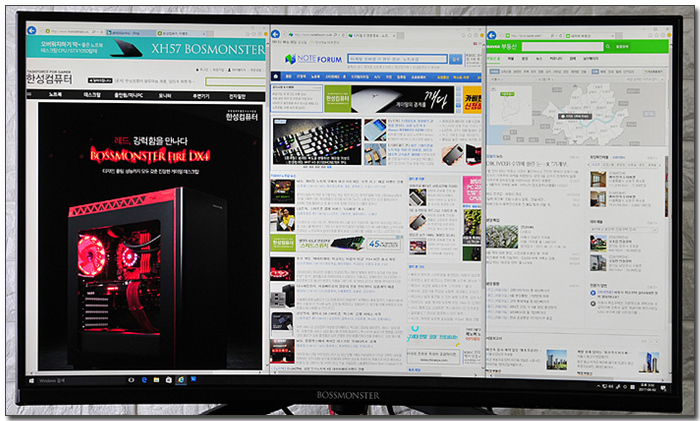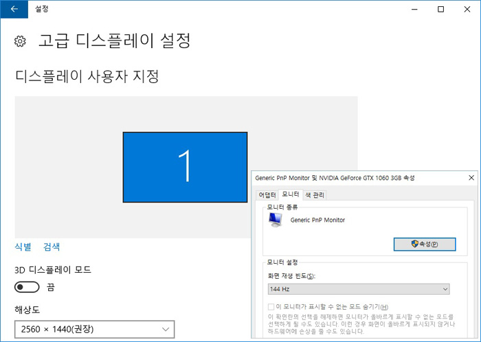 디자인 부분에서 강조한 것과 같이 이 제품은 FHD 해상도를 지원하는 경쟁 모델들과 달리 WQHD 에서도 144Hz를 활용할 수 있는 최고급형 제품이다. (마우스 오른쪽 버튼을 눌러 디스플레이 설정에 들어가 고급 디스플레이를 선택하고 어댑터 속성표시-모니터로 이동하면 사진과 같이 화면 재생빈도 설정이 가능하다.) 또한 2개의 창을 띄어둘 수 있는 FHD 모델들과 달리 약 2.5~3개의 창을 동시에 띄어둘 수 있어 멀티테스킹에 유용하게 활용할 수 있을 것이다.