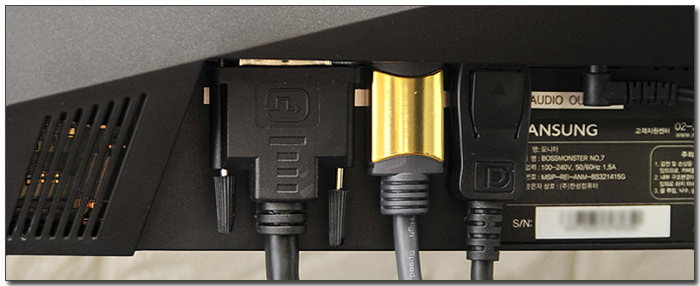 테스트를 위해 모니터를 셋팅한 모습으로 32형 대화면을 지원해 꽉 찬 느낌을 받을 수 있었다. 사진과 같이 다양한 단자를 지원해 원하는 스타일 대로 연결해 사용할 수 있지만 WQHD 해상도에서 144Hz를 사용하려면 DP 나 HDMI를 사용해야 한다. (DVI 는 60Hz 지원)