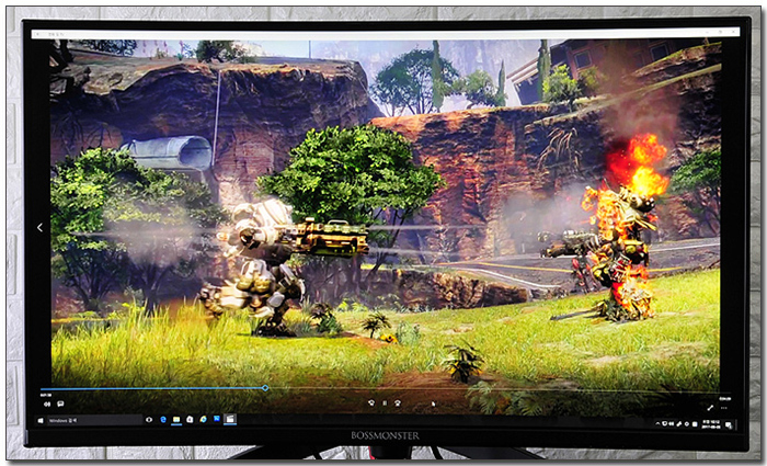 이 제품은 1800R 곡률을 지원하는 커브드 모니터로 일반 제품대비 화면에 집중할 수 있는 환경을 제공한다. 상단의 사진은 4K 동영상을 이용해 테스트를 진행하고 있는 모습으로 확연한 명암대비와 자연스러운 느낌의 컬러 표현으로 부담없이 영상을 즐길 수 있었다. (게이밍 뿐만 아니라 동영상 감상 등의 멀티미디어 용도로도 흠잡을 때 없는 모델이다.)