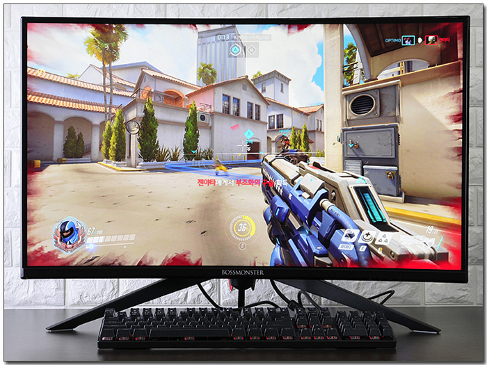 WQHD 해상도에 144Hz 로 설정후 오버워치를 실행한 모습으로 FHD 게이밍 모니터와 달리 디테일이 더해진 제품답게 더 확연한 부드러움을 경험할 수 있었다. 특히 32형 대화면을 지원해 시원시원한 영상을 구현했으며 색감또한 부족함이 느껴지지 않았다. (화면 움직임에 둔감한 유저들도 확연히 느낄 수 있을만큼 기존 60Hz 와는 큰 차이를 보여 주었다. '이런맛에 144Hz 모니터를 사용 하는구나' 라는 말이 절로 나온 제품이었다.) 특히 3ms 의 빠른 응답속도와 AMD 프리싱크도 지원해 화면이 찢어지는 것과 같은 이상현상 없이 게임을 즐길 수 있다. (게이밍과 관련된 대부분의 고급 기능을 지원하는 모델이라 생각하면 될 것이다.)