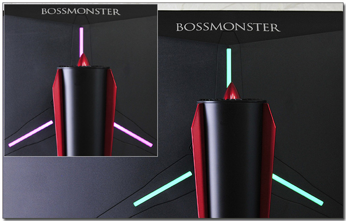 후면 중앙에는 사진과 같이 RGB 라이트닝을 지원해 디자인 만족감을 높인 것을 확인할 수 있다. 특히 컬러 설정이 가능하도록 E-MENU와 OSD에서 설정을 지원해 간편하게 조명 효과를 변경할 수 있다.