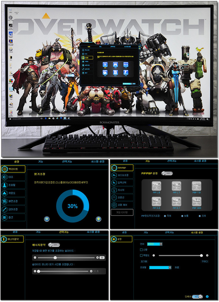 기존 제품들과 달리 지원 메뉴가 상당히 세분화 된 것을 확인할 수 있다. 화질 및 컬러 셋팅 뿐만 아니라 PIP/PBP, 블루라이트, 화면 모드 등의 설정을 지원하는 것이 눈에 띈다.