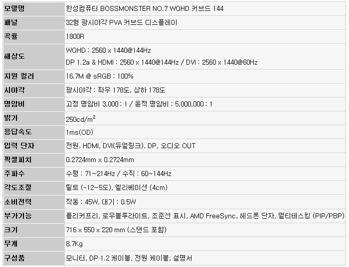이번에 리뷰를 진행 할 한성컴퓨터 BOSSMONSTER NO.7 WQHD 커브드 144 또한 상단에 말씀드린 모든 조건을 만족시키는 제품이다. 단, FHD 해상도를 지원하는 대부분의 게이밍 모니터와 달리 WQHD 해상도를 지원해 한층 높인 디테일을 경험할 수 있을 뿐만 아니라 커브드 디스플레이 탑재로 높은 몰입감을 선사한다.