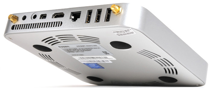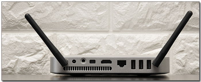 기기 후면부의 모습으로 주요 단자부가 밀집된 것을 확인할 수 있다. 블루투스와 무선랜 사용을 위한 2개의 안테나 연결 단자가 양 측면에 배치되어 있고 듀얼 모니터 활용을 위한 HDMI,mDP 단자를 지원한다. 특히 mDP 단자는 4K UHD@60Hz를 지원해 고화질 디스플레이 연결용으로 활용할 수 있다.