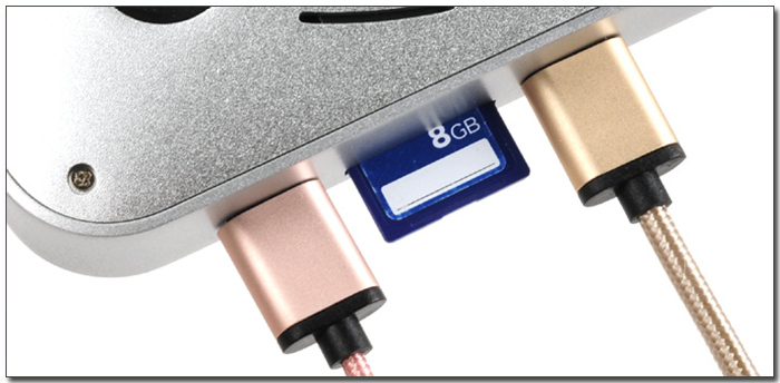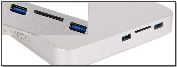 기기 우측면의 모습으로 2개의 USB 3.0 단자를 지원해 빠른 데이터 전송이 가능하며 SD 메모리 슬롯이 지원되어 디지털카메라 등에서 촬영한 사진을 빠르게 백업 받을 수 있다.