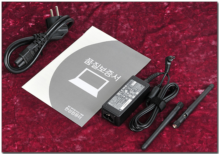 기본 제공되는 액세서리의 모습으로 보증서와 2개의 안테나, 전원 어댑터와 케이블이 제공된다.