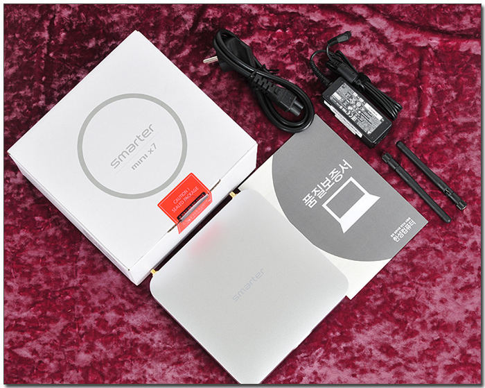 풀KIT 의 모습으로 본체를 비롯해 전원 어댑터와 케이블이 제공되며 보증서와 2개의 안테나가 포함된 것을 확인할 수 있다.