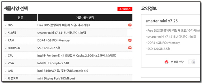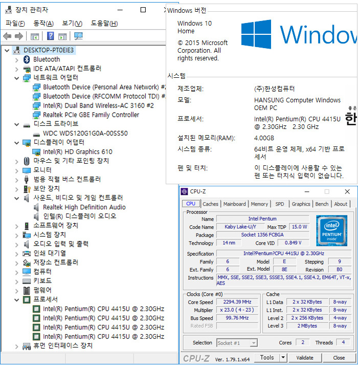 시스템 등록정보의 모습으로 카비레이크 기반의 4415U 펜티엄 프로세서가 탑재되어 있으며 4GB 의 DDR4 메모리를 지원한다. 여기에 120GB SSD를 탑재해 체감성능의 향상을 꾀했으며 블루투스, 무선랜 등을 지원해 편의성을 높인 것을 확인할 수 있다.