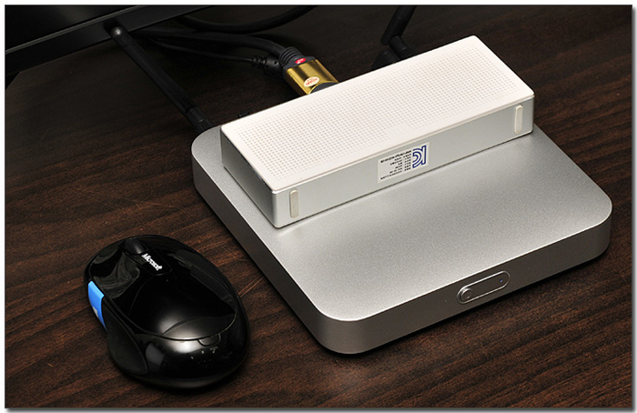 이 제품은 작은 크기와 세련된 디자인을 가지고 있어 거실의 HTPC 나 매장용PC 로 손색없는 모습을 보여준다. 상단의 사진은 거실의 TV와 연결해 홈시어터PC 시스템을 구축한 모습으로 손쉽게 설치할 수 있었을 뿐만 아니라 케이블로 인한 스트레스도 없었다.