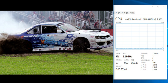 하단의 사진은 4K 동영상을 재생해 CPU점유율을 테스트 하고 있는 모습으로 3~6% 대의 안정적인 모습으로 보여 주었다. 웹서핑과의 멀티테스킹시 65% 까지 점유율이 올라가긴 동영상과 인터넷 모두 딜레이는 발생하지 않았다. (고성능을 필요로 하는 S/W가 이니라면 멀티테스킹도 충분히 가능한 모델이다.)