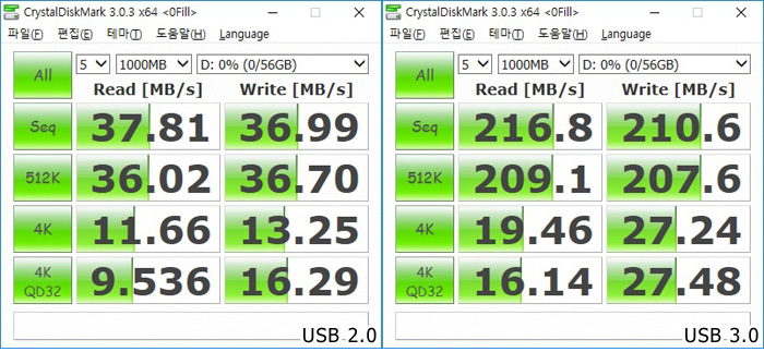 2개의 USB 3.0 단자를 제공해 빠른 데이터 전송이 가능하다. 상단의 사진은 USB 2.0 단자와 3.0 단자의 속도를 비교한 모습으로 큰 차이가 발생하는 것을 확인할 수 있었다. (전작과 달리 측면에 USB 3.0 단자를 배치해 좀더 편하게 저장장치를 연결할 수 있었다.)