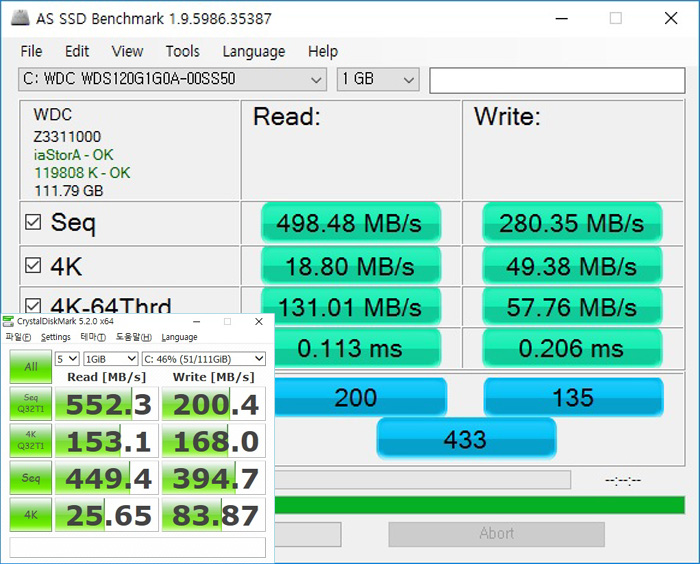 기본 장착된 120GB SSD 의 속도를 측정한 모습으로 500MB/s 이 넘는 빠른 읽기 속도를 지원해 답답함 없이 PC를 사용할 수 있을 것이다. @ 사용 할당량 셋팅에 따라 결과값이 달라질 수 있다. 이점 참조 바란다.