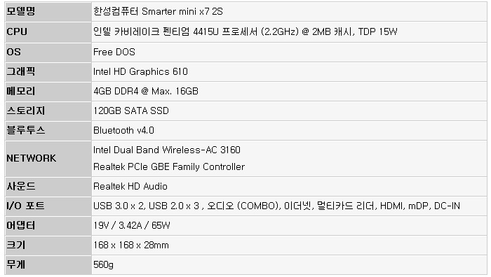 이번에 리뷰를 진행 할 한성컴퓨터 Smarter mini x7 2S 는 뛰어난 공간 활용성에 기본 이상의 퍼포먼스를 구현하는 미니PC를 구입하고자 하는 유저들을 위한 제품으로 카비레이크 기반의 펜티엄 프로세서를 탑재해 캐주얼한 작업은 답답함 없이 실행할 수 있으며 SSD를 탑재해 체감성능을 높였다. 여기에 메모리 업그레이드도 가능해 더 높은 성능을 구현할 수 있는 장점이 있다.