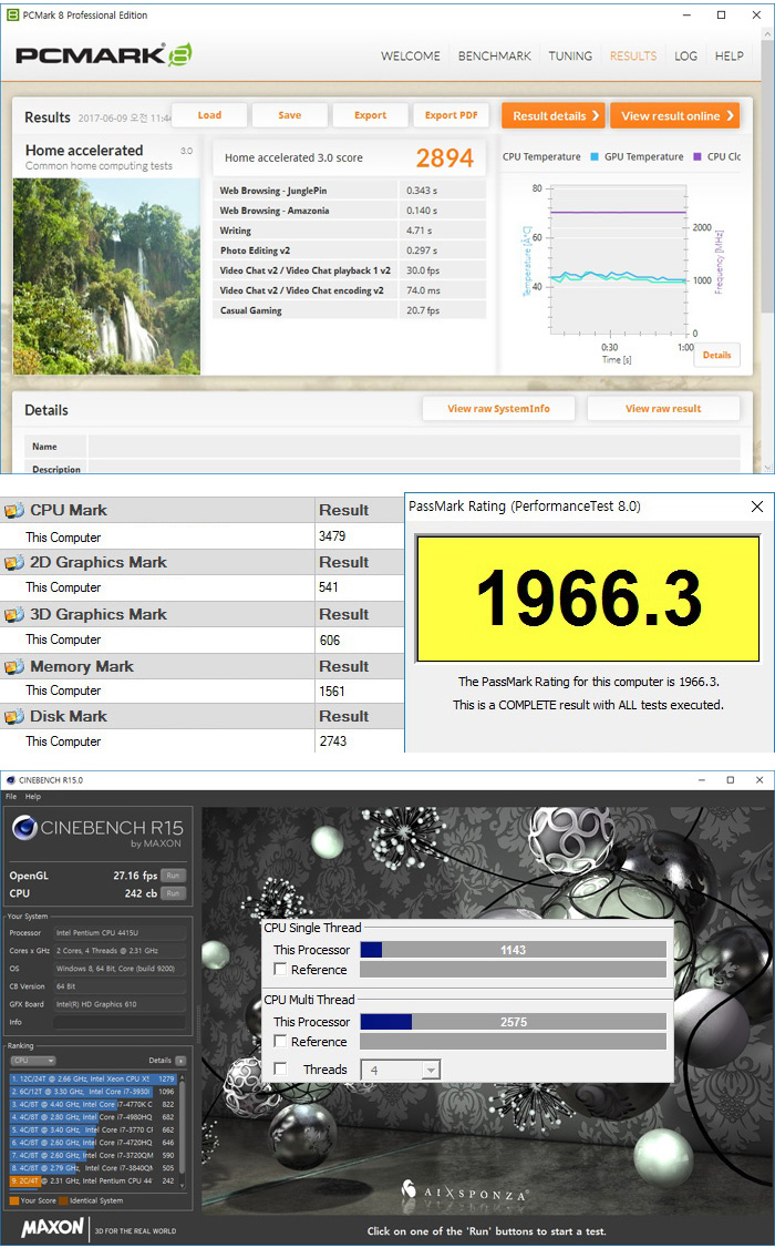 벤치마크 프로그램을 통해 기기의 성능을 확인하고 있는 모습으로 일반적인 작업용으로는 전혀 무리없는 스코어를 보여 주었다. 특히 SSD를 사용해 체감성능을 확인하는 PCMARK 의 점수가 대단히 높은 것을 확인할 수 있으며 프로세서 스코어 또한 i3 정도에 견줄수 있는 수준이다. (물론 i3 보다는 스코어가 낮다.)