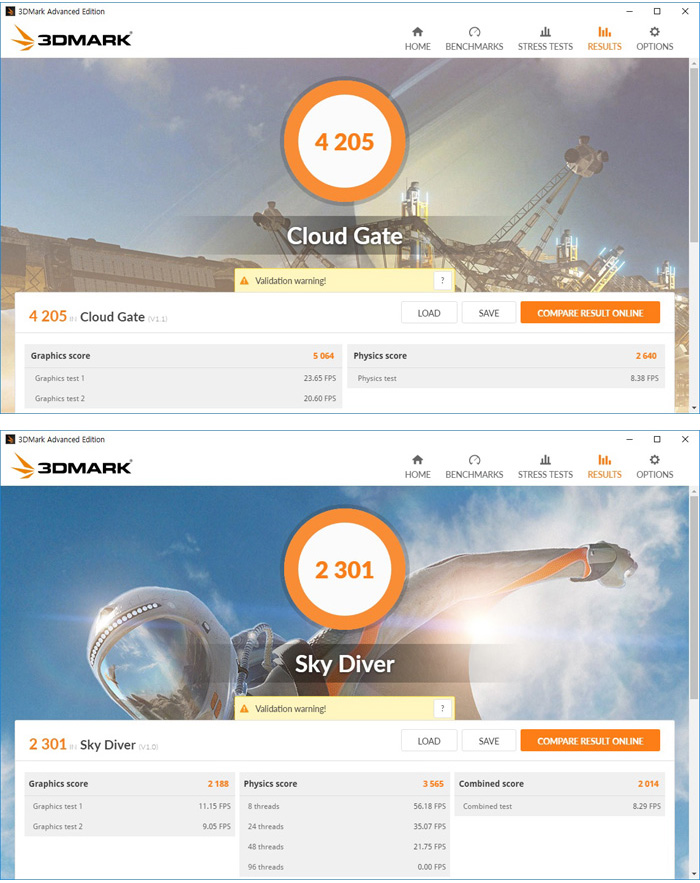 내장 그래픽 성능을 확인하기 위해 3DMARK를 구동한 모습으로 심플한 온라인 게임 정도는 구동할 수 있느 스코어를 보여 주었다. (단, 게임용으로 활용하는 것은 추천하고 싶지 않다.)