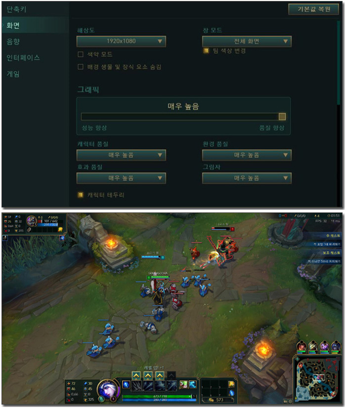 LOL을 중간 옵션 (소환사의 습격 맵, AI 모드) 에서 실행하고 있는 모습으로 27-34 프레임을 보여 주었다. (게임실행은 충분히 가능하다. 단, 멀티게임을 즐기려면 옵션을 낮추어야 한다.)