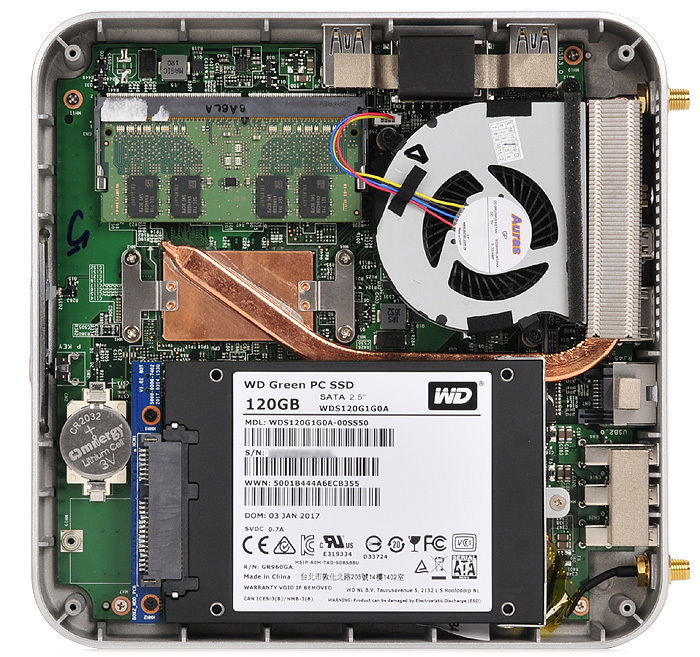 기기 바닥면 내부의 모습으로 심플하게 구성된 것을 확인할 수 있다. 높은 성능을 구현하는 카비레이크 4415U 펜티엄 프로세서에 쿨링펜이 설치되어 있으며 메모리 슬롯에 4GB DDR4메모리가 장착되어 있다. DDR3L 메모리를 사용하는 제품들의 경우 16GB 단일 메모리를 사용하지 못하는데 반해 이 제품은 DDR4 메모리를 지원해 더 높은 퍼포먼스를 구현하는 것은 물론 최대 16GB 단일 메모리로 RAM 확장이 가능하다.