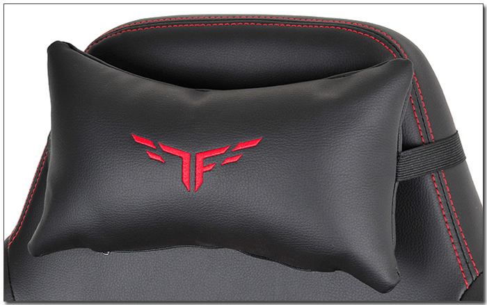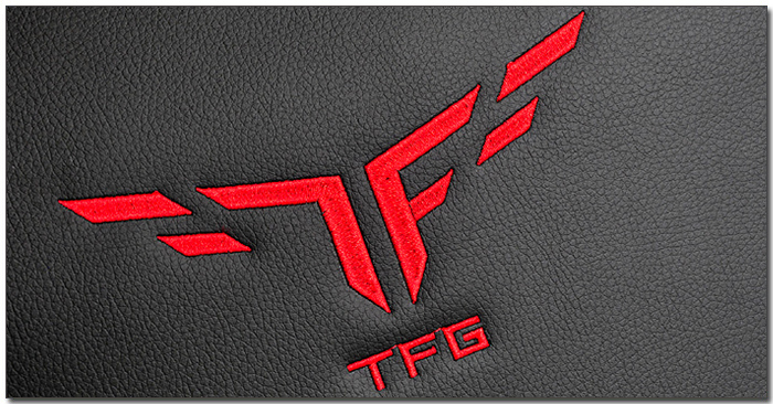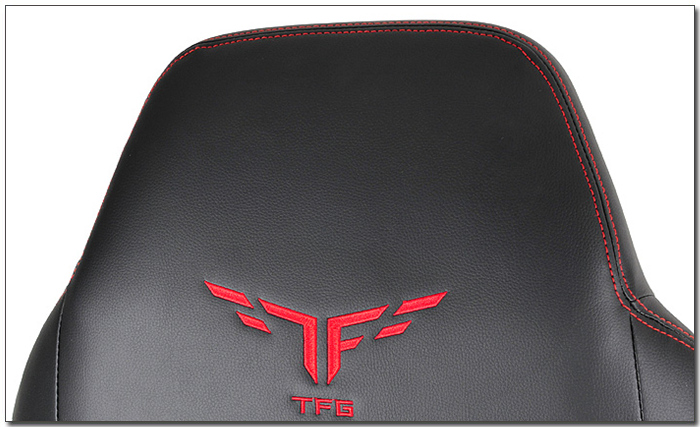 등받이 후면의 모습으로 깔끔하게 구성되어 있다. 중앙에는 한성컴퓨터의 게이밍 기어를 상징하는 TFG(TASKFORCE FOR GAMER)로고가 세겨진 것을 알 수 있다.