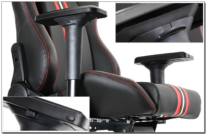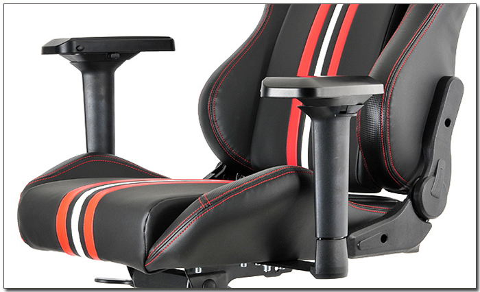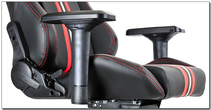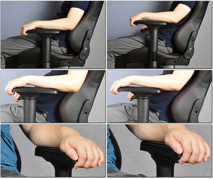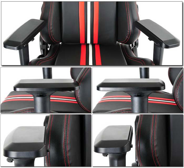 팔걸이 높낮이 조절 기능만을 제공하는 대부분의 게이밍 의자와 달리 이 제품은 4D 팔걸이를 사용해 사진과 같이 상하좌우 위치 조절 기능이 제공되며 기본 각도 조절이 가능한 것을 확인할 수 있다.(사용자의 편안함을 추구하기 위한 장치라 할 수 있다.)