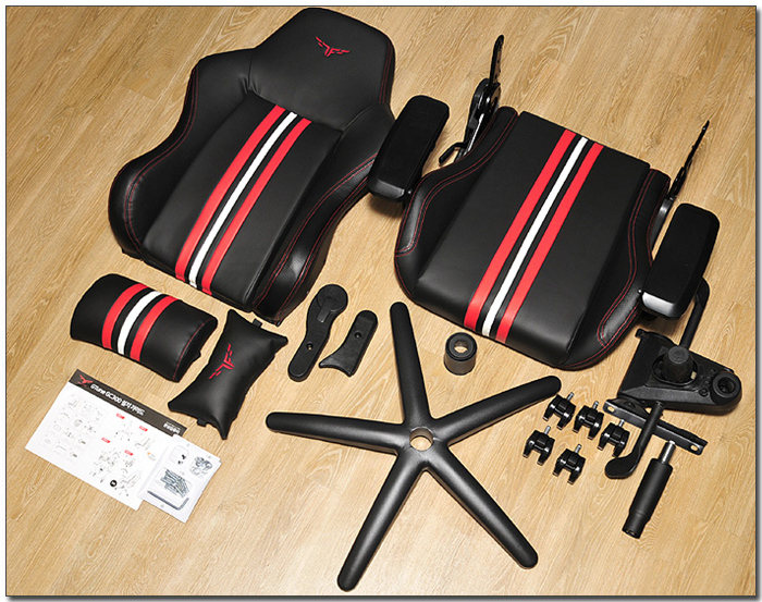 풀KIT 의 모습으로 등받이 및 좌석 시트, 팔걸이, 사이드 커버, 가스스프링, 메탈베이스 및 5개의 바퀴가 제공되며 시트 컨트롤러와 설명서, 헤드 및 등받이 쿠션, 조립용 툴 및 볼트 등이 포함된 것을 확인할 수 있다.