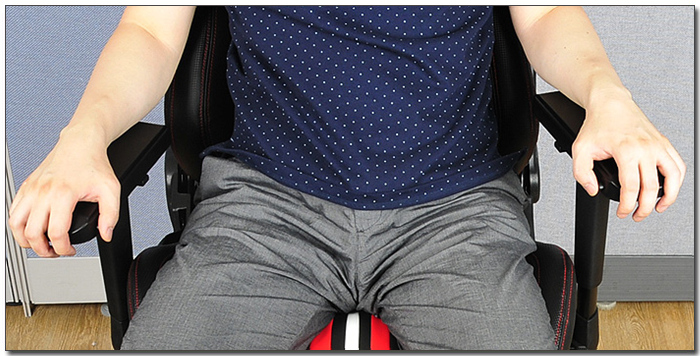 착석감을 확인하고 있는 모습으로 디자인 부분에서 말씀드린 것과 같이 넓은 좌판 및 등판시트 탑재로 다리를 벌리고 앉아도 답답한 느낌은 전혀 없었으며 양쪽에서 엉덩이를 받쳐주도록 설계되어 장시간 앉아 있었을 때에도 몸이 틀어지는 현상이 발생하지 않았다.