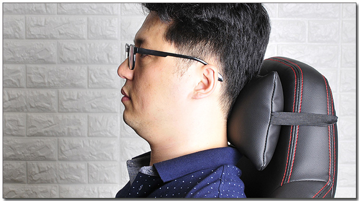 헤드 부분의 모습으로 184Cm 의 신장임에도 짧다는 느낌은 들지 않았다. 또한 헤드쿠션이 기본 제공되어 사용자의 취향에 따라 활용할 수 있다.(필자의 경우 헤드쿠션을 목 부분에 설치했을 때 훨씬 편한 느낌을 받았다.)