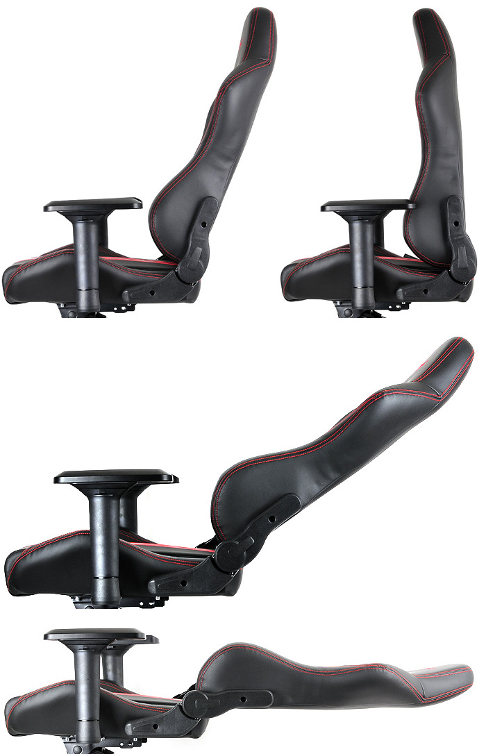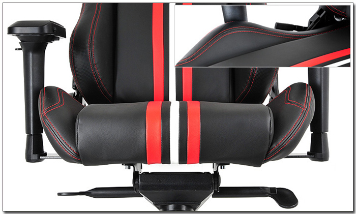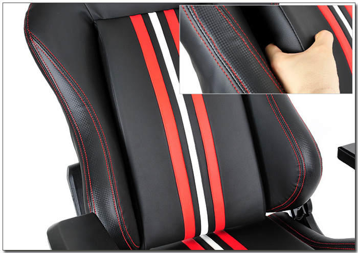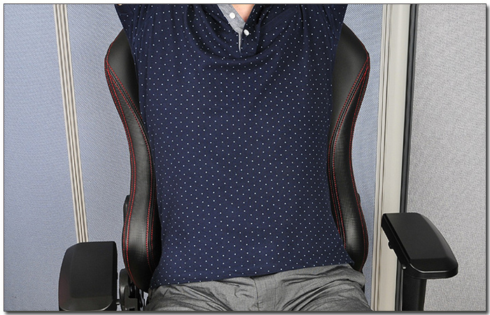 등판 시트의 모습으로 레이싱 버킷시트 스타일을 적용해 몸을 잡아주도록 설계된 것을 확인할 수 있다.(일반 의자와 확연히 다른 부분이라 할 수 있다.)이를 통해 장시간 게임으로 몸이 흐트러지는 것을 미연에 방지할 수 있다. 또한 장기간 사용시 커버가 늘어나는 것을 미연에 방지하기 위해 컬러 라인을 적용한 것도 눈에 띈다.