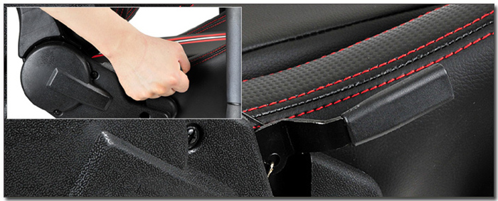 좌측에는 등받이 각도조절을 위한 레버가 설치되어 있다. 내부에 스프링이 설치되어 사진과 같이 당긴 상태에서 등에 힘을 주어 원하는 각도를 만들 수 있다.