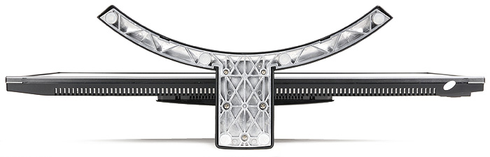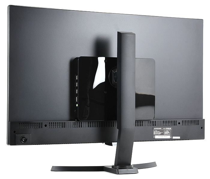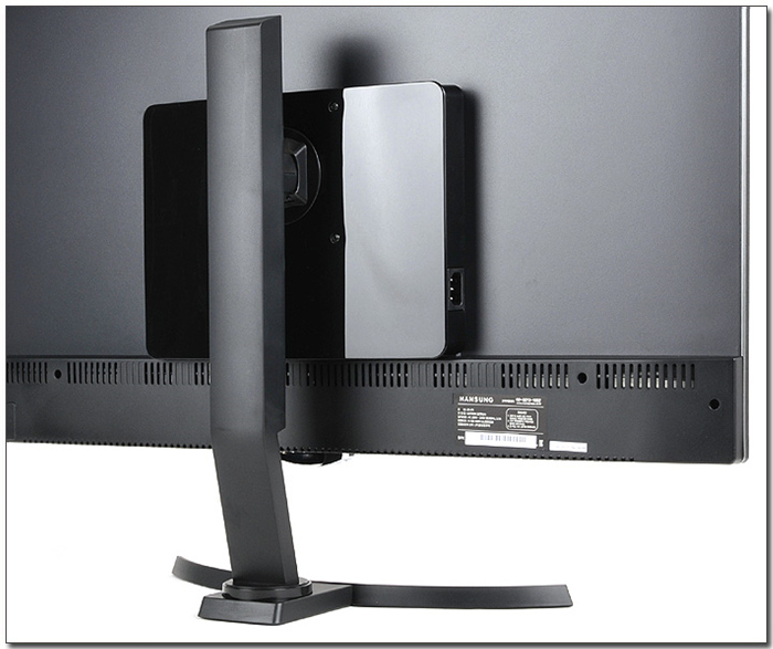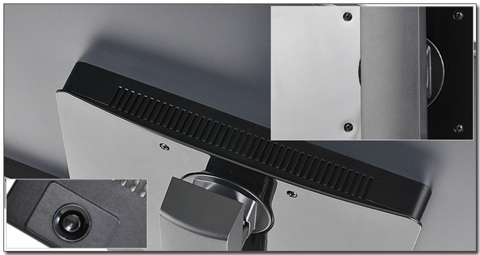 기기 후면부의 모습으로 하단과 상단에 통풍구가 설치되어 있으며 손쉬운 OSD 컨트롤을 위해 조그다이얼이 부착된 것을 확인할 수 있다. (무선 리모콘 까지 지원해 모니터 설정이 대단히 편하다.) 또한 중앙에는 베사홀이 설치되어 벽걸이 용도로도 활용할 수 있다. (단, 베사홀 사용시 후면 커버를 분리해야 한다. 이점 참조 바란다.)