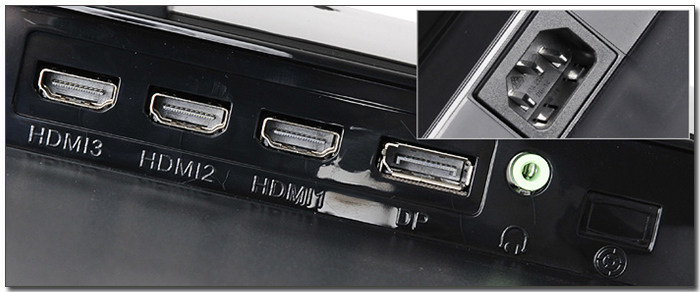 일반 모니터와 달리 원할한 피벗 기능 활용을 위해 단자부가 양 측면에 배치된 것이 눈에 띈다. 좌측면에는 전원 단자가 설치되어 있으며 우측에는 2개의 HDMI 1.4를 비롯해 HDMI 2.0 과 DP1.2, 오디오 출력 단자가 제공되는 것을 확인할 수 있다.