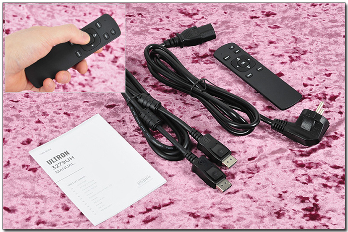 기본 제공되는 액세서리의 모습으로 설명서와 무선 리모콘, DP 케이블, 전원 케이블 등이 포함된 것을 확인할 수 있다.