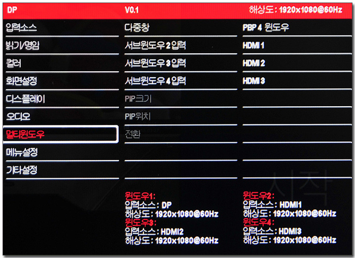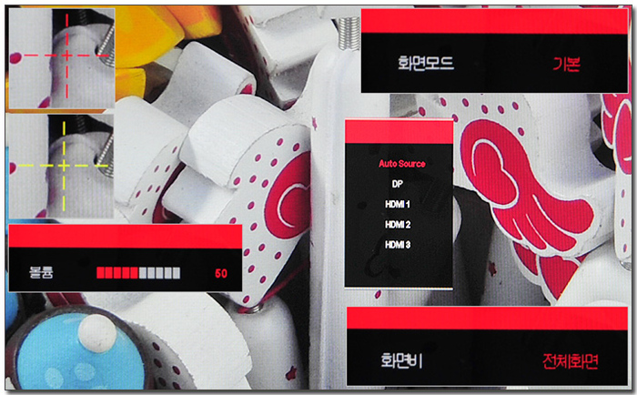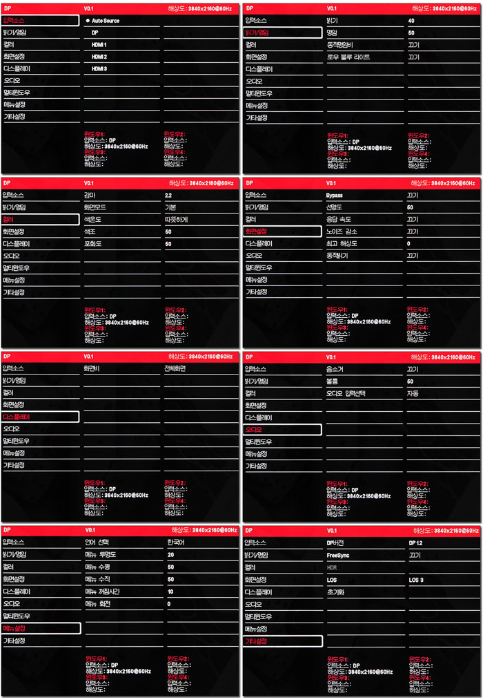 OSD 메뉴의 모습으로 입력소스 및 밝기, 명암, 컬러 설정이 가능하며 다양한 화면 설정 및 화면비 지정도 지원하는 것을 확인할 수 있다. 또한 오디오 메뉴가 제공되며 PIP 와 PBP 설정이 가능한 멀티윈도우, OSD 설정, 프리싱크 등의 설정을 지원한다. (HDR 의 경우 HDR 지원기기 연결 상태에서 활성화 된다.)