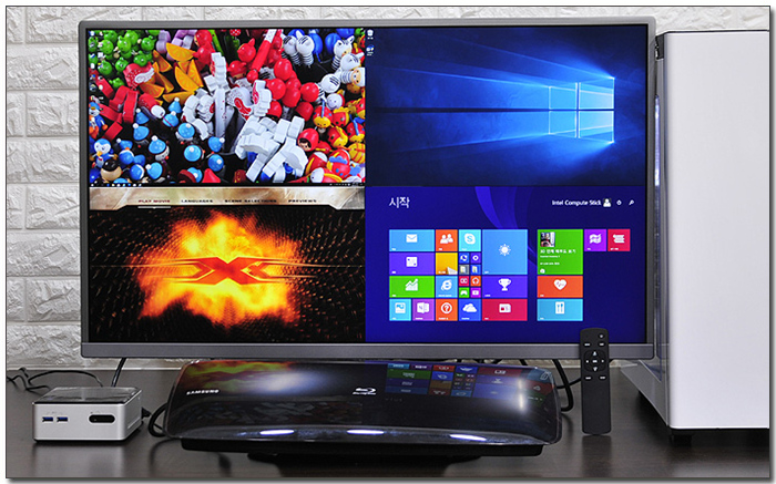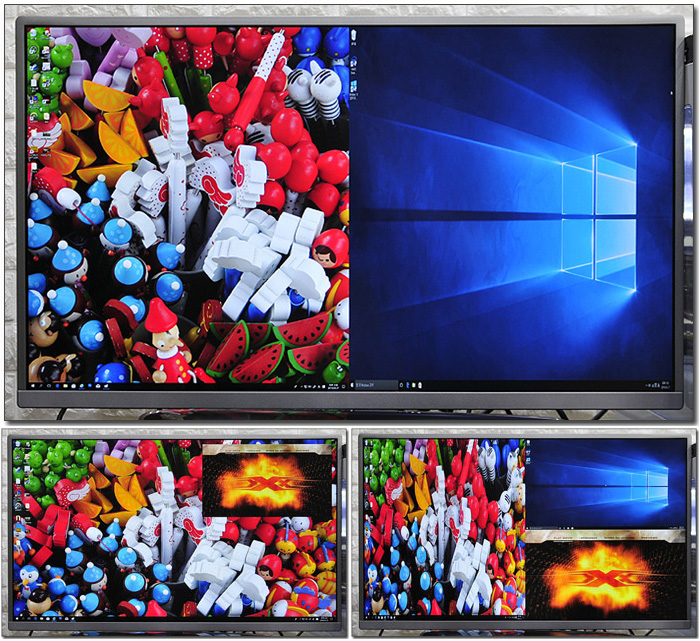 이 제품은 최대 4분할 PBP를 지원해 탁월한 멀티테스킹을 구현할 수 있다. 상단의 사진은 데스크탑PC, 미니PC, 스틱PC, 블루레이 플레이어를 연결해 테스트를 진행하고 있는 모습으로 4개의 디자이스 모두 정상적으로 작동하는 것을 확인할 수 있었다. 다양한 기기 영상을 하나의 모니터에서 확인해야 할 경우 무척 유용할 것이다.