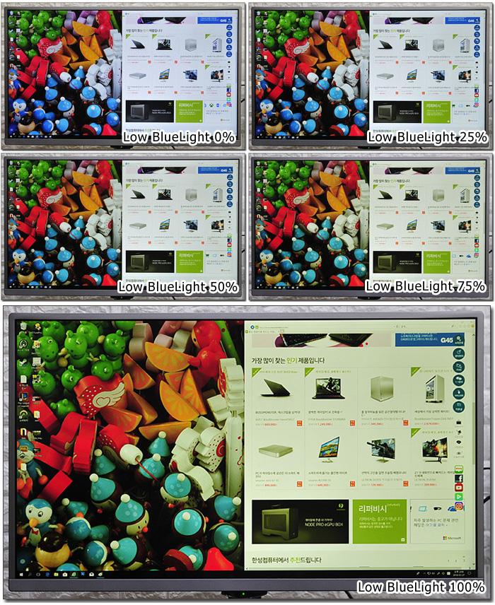 청색파장으로부터 눈을 지킬 수 있는 블루라이트 감소 기능을 제공하고 있다. 사진과 같이 효과를 단계별로 적용할 수 있어 라이프 스타일에 따라 선택해 사용할 수 있다. 또한 안티글레어 패널까지 더해져 난반사로 인한 눈의 피로나 시인성 감소 등도 미연에 방지할 수 있다.