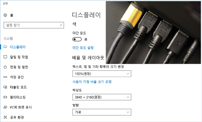 4K 해상도를 지원하는 제품으로 가독성을 위해 항목 크기변경을 원하는 스타일 대로 설정하는 것이 필요하며 피벗 사용시에는 방향을 세로로 설정해야 한다.