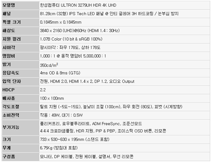 이번에 리뷰를 진행 할 한성컴퓨터 ULTRON 3279UH 는 UHD 모니터에 대중화를 이끌 만한 모델이라 할 수 있다. 가격 부담을 최소화 한 것은 물론, HDR 기술을 탑재해 게임 콘솔 등과 연결해 생동감 넘치는 화면을 즐길 수 있다. 32형 대화면으로 시각적 만족감을 높였을 뿐만 아니라 PIP 와 PBP 같은 화면분할 기능과 다양한 화면 각도 변경등을 지원해 사용성을 한층 높인 것도 확인할 수 있었다.
