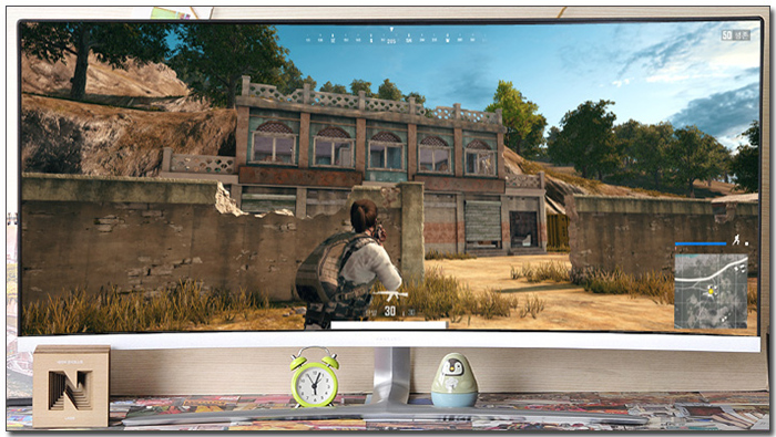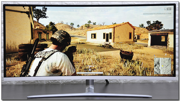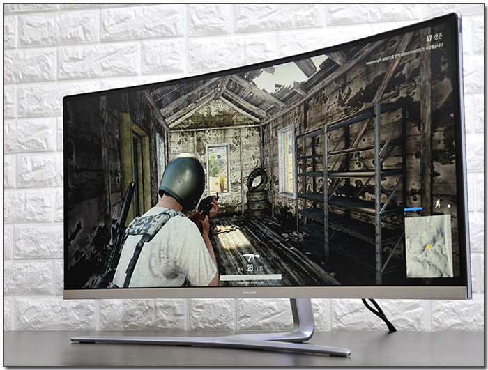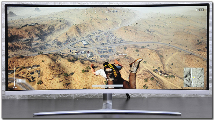 배틀그라운드를 실행한 모습으로 16:9 비율의 일반 모니터와는 확연히 비교되는 많은 영상이 제공되는 것을 확인할 수 있었다. 전장상황의 파악도 훨씬 수월했을 뿐만 아니라 적의 움직임 등에도 기민하게 반응할 수 있었다. 특히 눈앞에 펼쳐진 대화면으로 한층 높은 게임 몰입감을 경험할 수 있을 것이다.