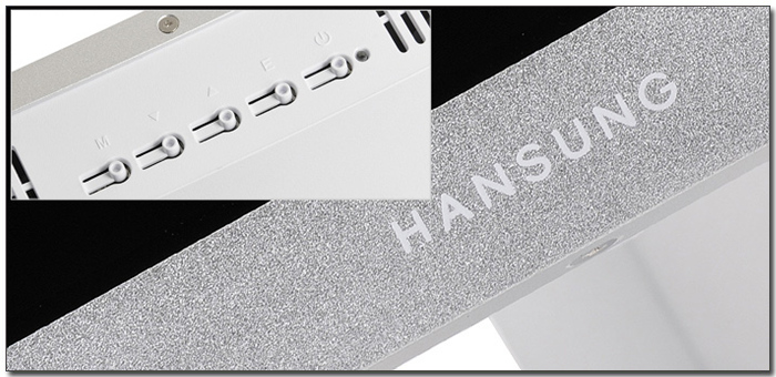 전면 하단부의 모습으로 실버 컬러를 적용해 포인트를 준 것이 눈에 띈다. 한성 문구 하단에는 OSD 버튼이 설치되어 있어 모니터의 각종 기능을 손쉽게 셋팅할 수 있다.