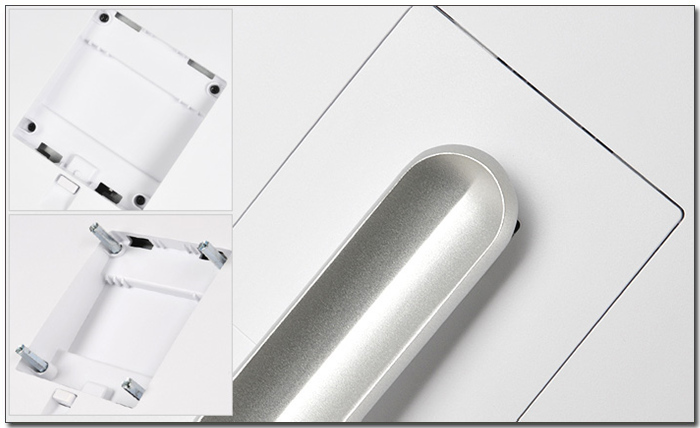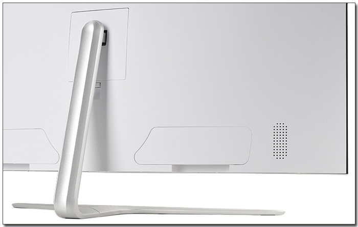 LED 광원을 적용해 발열을 최소화한 모델답게 후면에는 통풍구가 설치되지 않은 것이 눈에 띈다. 스탠드 탈부착이 가능하다. 내부에는 100 x 100 마운틀홀이 설치되어 벽에 걸어 사용할 수 있다. (좀더 용이하게 벽에 걸어 사용할 수 있도록 지지대도 별도로 제공하고 있다.)
