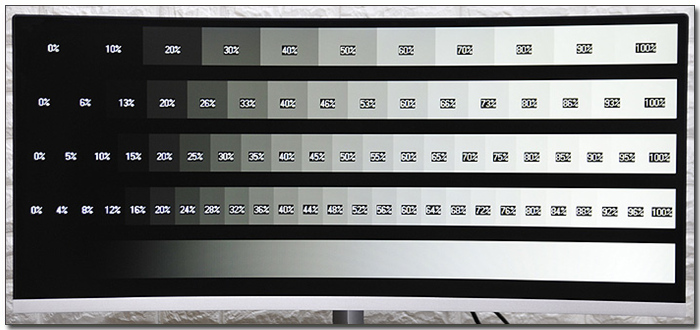 1,000 : 1 의 명암비를 지원하는 IPS 계열의 모니터와 달리 3,000 : 1 의 고정 명암비를 지원해 더 깊이있는 색감을 경험할 수 있다. 상단의 그레이스케일 차트는 완벽하게 구분할 수 있었다.