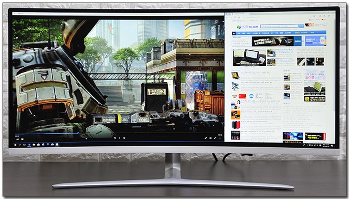 21:9 비율에 WQHD 해상도 지원으로 멀티테스킹에 최적화된 모습을 보여준다. 사진과 같이 임의로 2개의 창을 띄어두고 작업할 수 있을 뿐만 아니라 PIP 와 PBP 기능을 통해 두 대의 디바이스를 연결해 하나의 모니터로 즐길 수 있다.