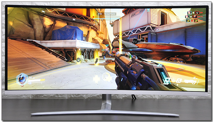 오버워치를 실행한 모습으로 100Hz 의 리얼 주사율을 지원하는 모델답게 빠른 움직임에도 부드럽게 반응하는 것을 확인할 수 있었다. 끊키는 듯한 현상없이 자연스럽게 영상이 구현되어 캐릭커의 움직임을 보다 정확하게 확인할 수 있었으며 어지럼증 등도 현저히 적어지는 것을 확인할 수 있었다.