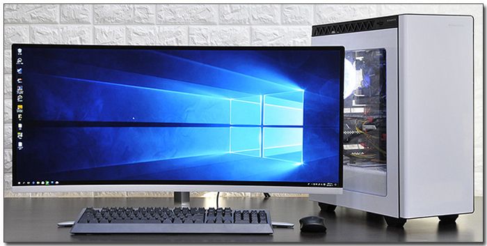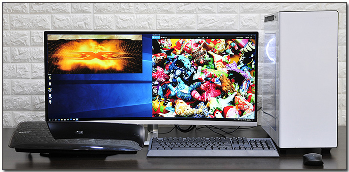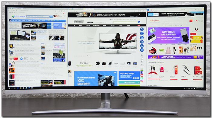 테스트를 위해 모니터를 셋팅한 모습으로 울트라 와이드 모니터 답게 가로폭이 무척 넓은 것을 확인할 수 있다. 디자인 부분에서 말씀드린 것과 같이 넉넉한 공간은 필수라 할 수 있다.