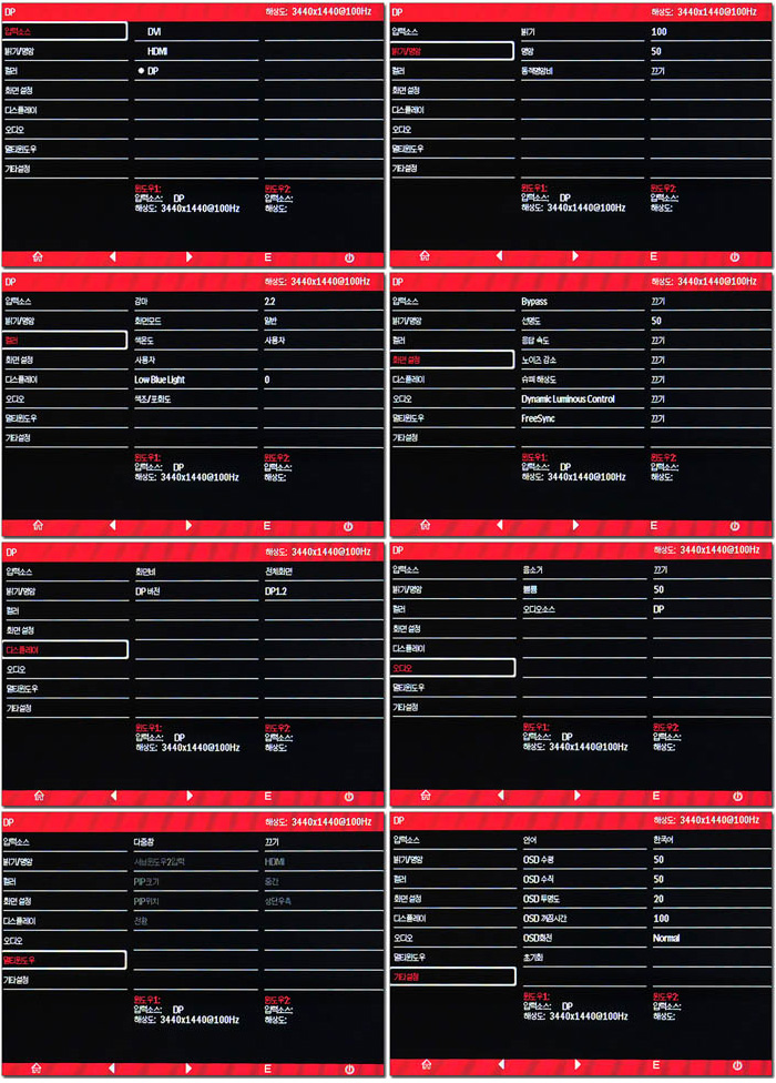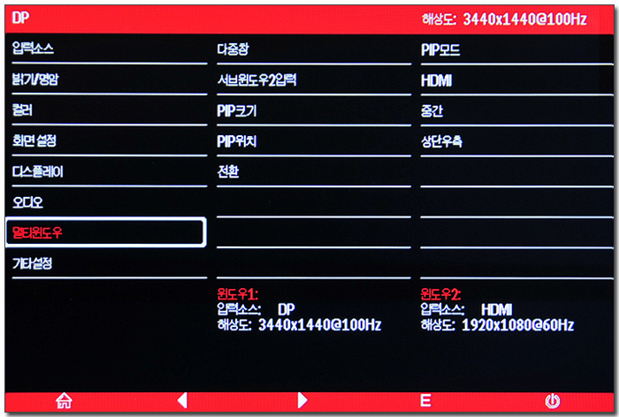 OSD 메뉴의 모습으로 입력소스 및 밝기, 명암, 컬러 설정이 제공되며 화면모드 설정 및 화면비 지정도 지원하는 것을 확인할 수 있다. 또한 PIP 와 PBP 설정이 가능한 멀티윈도우, OSD 설정 등이 가능하다. (보급형 모니터와는 비교되는 디테일한 설정이 제공된다.)