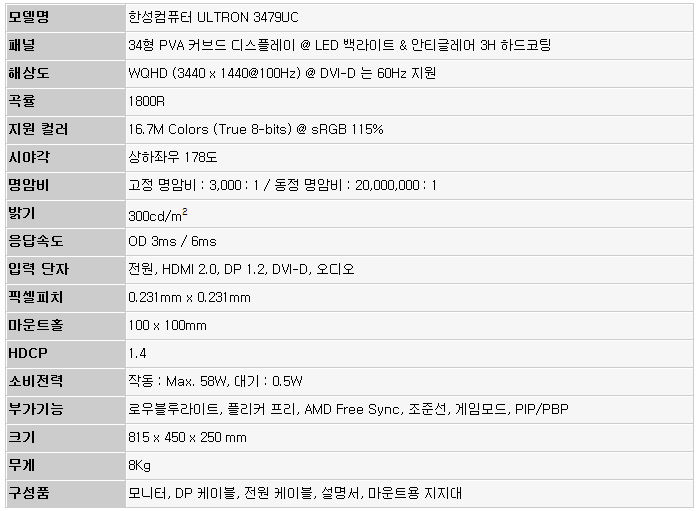 이번에 리뷰를 진행 할 한성컴퓨터 ULTRON 3479UC 은 상단에 말씀드린 모든 조건을 만족시키는 최고급형 게이밍 모니터로 21:9 비율을 지원해 더 많은 게임 정보를 한눈에 확인할 수 있으며 32형 크기에 WQHD 해상도를 지원해 게임 몰입감을 한층 높일 수 있다. 특히 21:9 비율과 WQHD 해상도를 지원함에도 리얼 100Hz 의 주사율과 OD 3ms 의 응답속도 지원으로 대부분의 게임을 쾌적하게 즐길 수 있다.